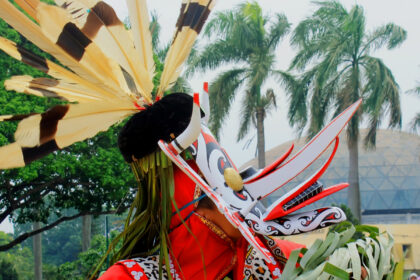 Makna filosofis topeng dan kostum Tari Hudoq dalam budaya suku Dayak yang melambangkan hubungan manusia, alam, dan dunia spiritual....